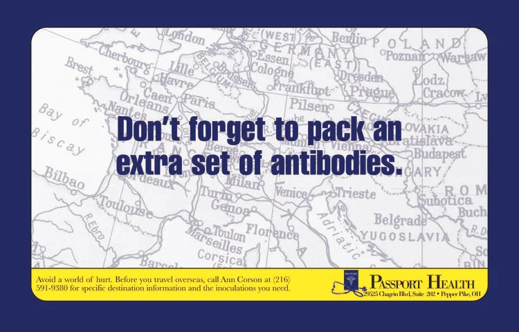 For this clinic which dispenses immunizations and vaccinations tailored to specific world destinations, I wrote and produced a series of postcards that were also used as print advertising.